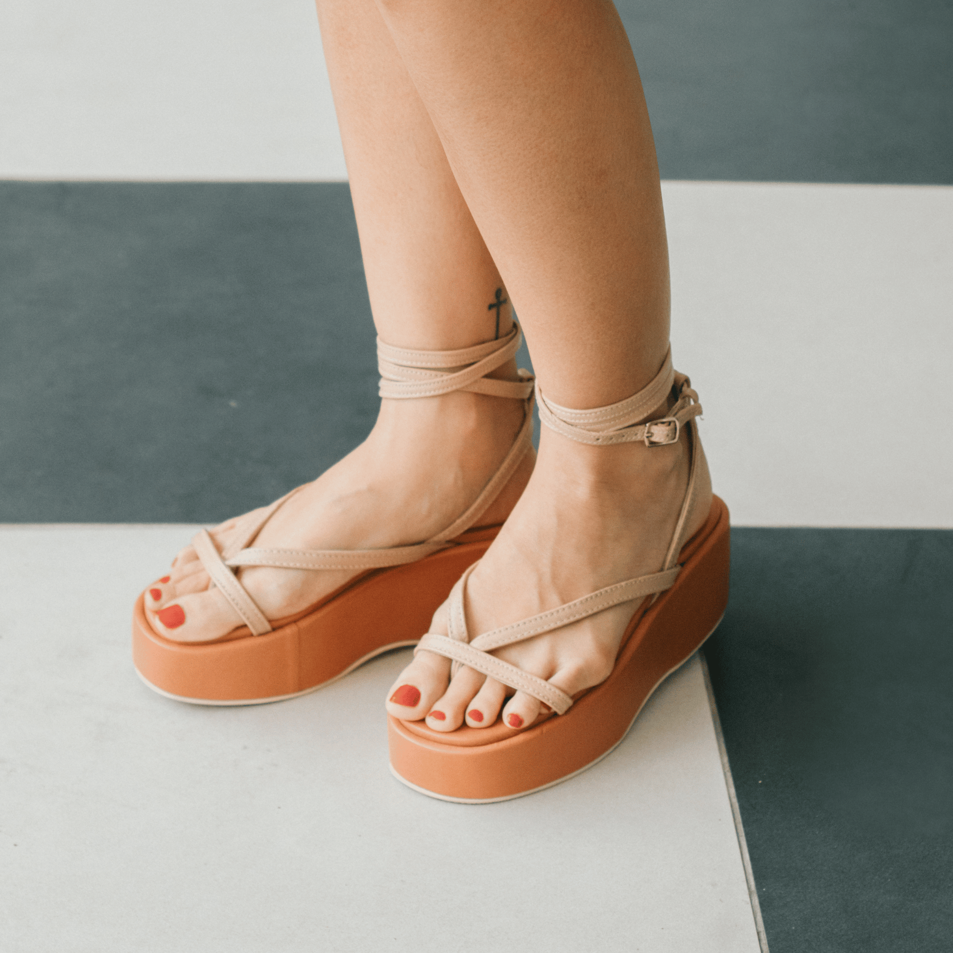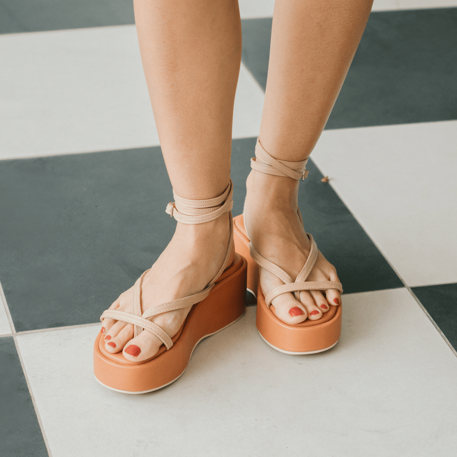 A chunky, ’90s-style platform designed to flatter and elongate, finished in a warm tan-and-beige colorway.