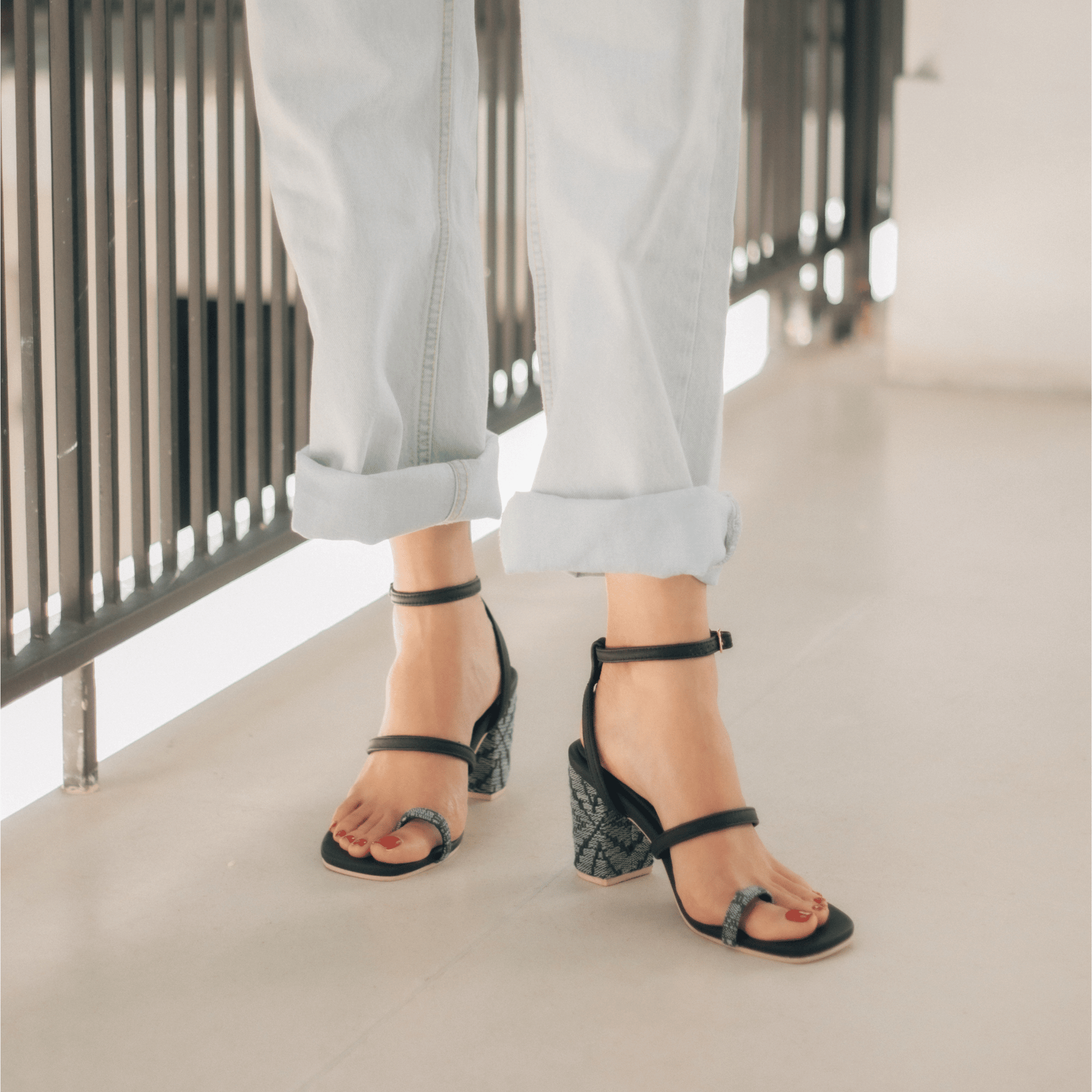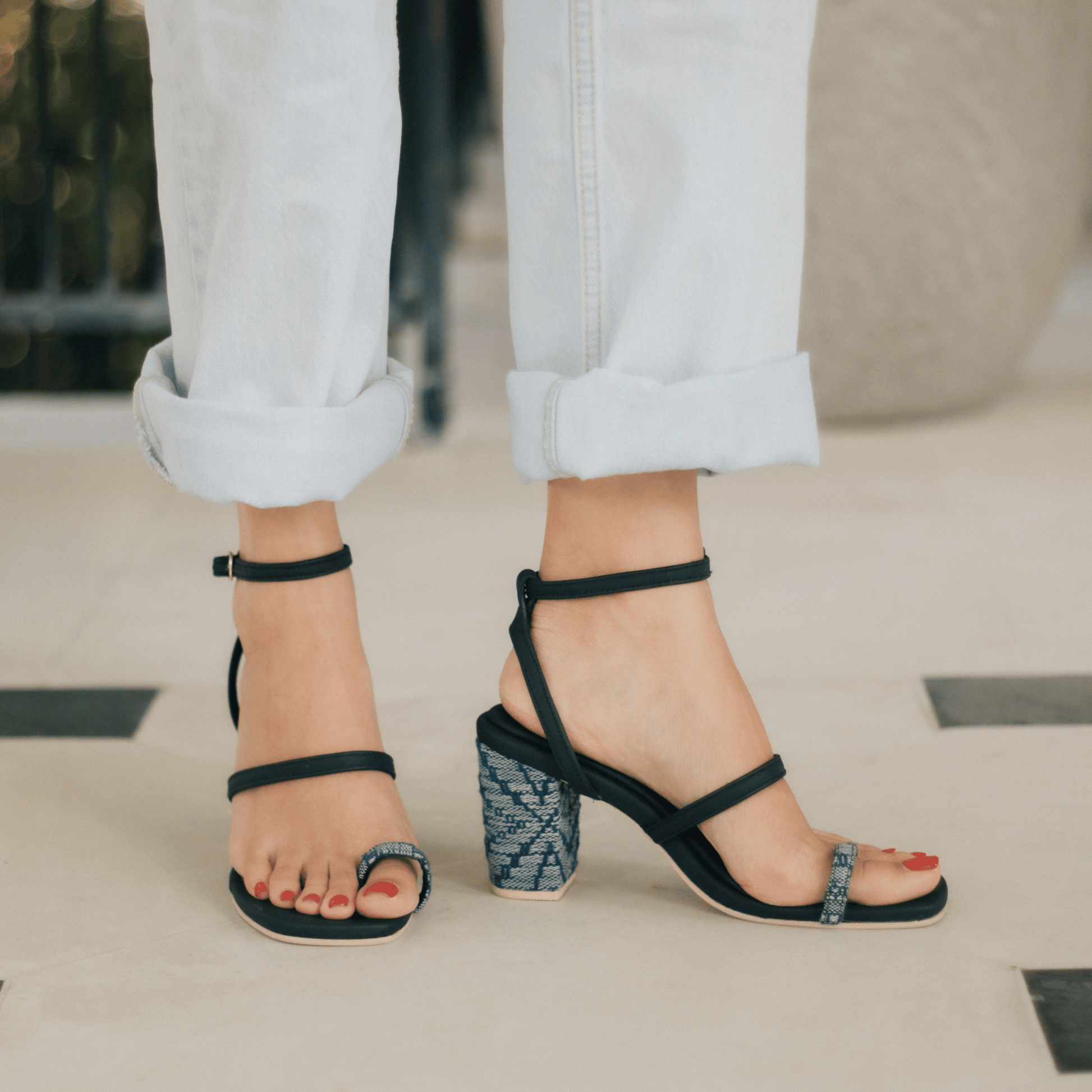Sexy leather straps, accented with a neutral, denim weave— throw this on with a pair of jeans or a little black dress, and you’re good to go!