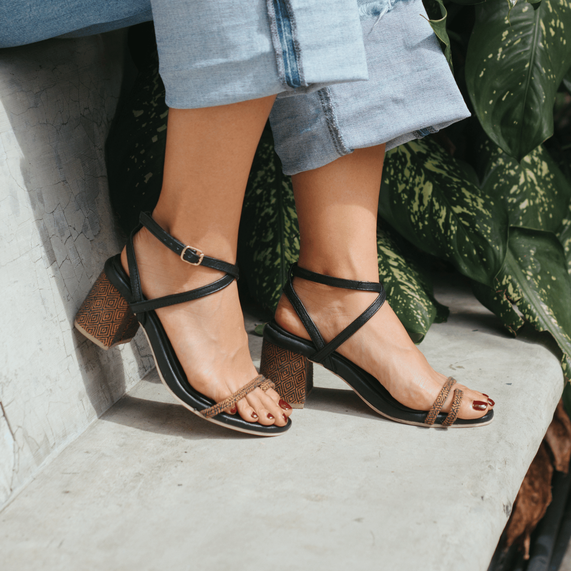 A chic standout with black straps, a textured brown toe strap, and a bold patterned block heel.