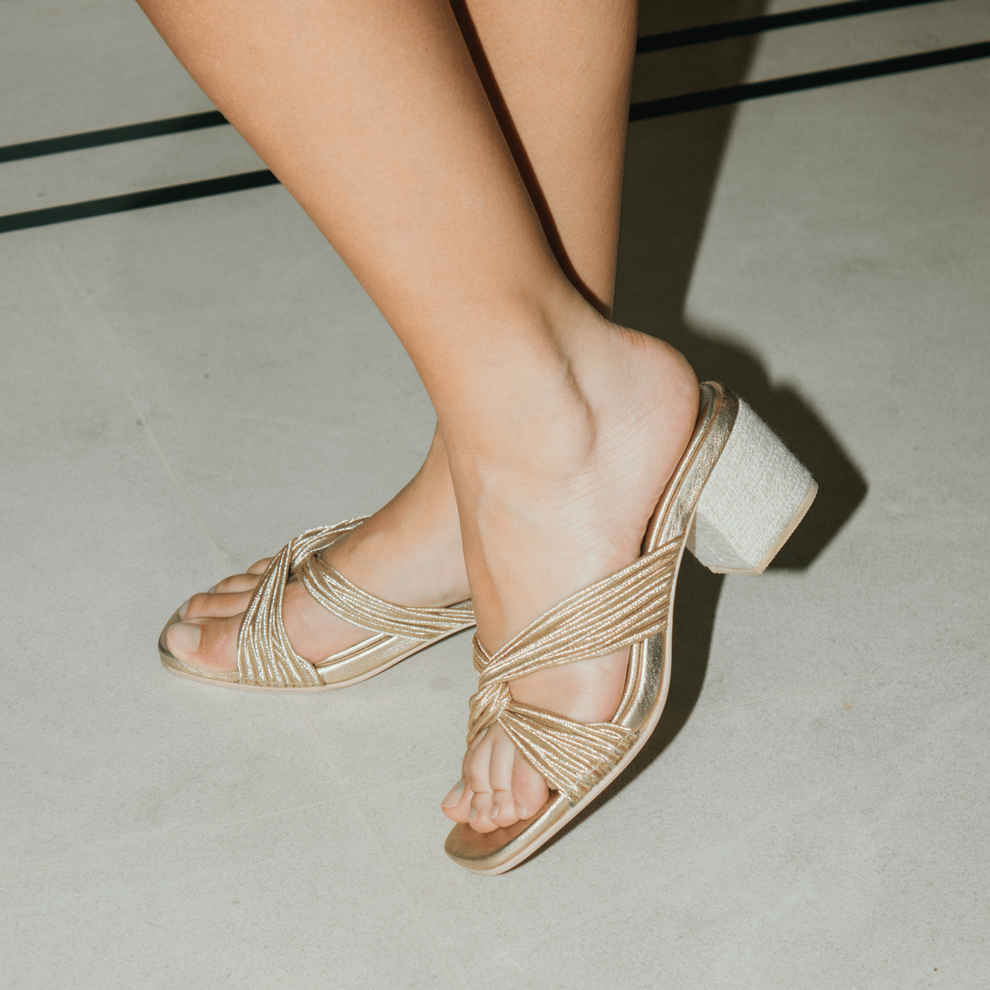 A striking slip-on in shimmery gold—featuring a beige textile heel, accented with metallic upper straps that make you stand out.